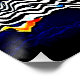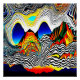 A.I. assisted print of a surreal, abstract mountainous landscape of undulating lines and vibrant colours is reflected in the clouds overhead.