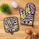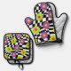 Get cookin' with these super mod chequered potholders or oven mitts with artwork by Buttercup's Clothing and Collectables. Super cute pot holders and oven mitts feature a funky pattern of daisies in shades of lime green , purple, and pink , against a black and white abstract checkers background. Available as set or sold separately.