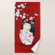 Une jolie poupée kokeshi dans un kimono blanc avec des papillons rouges. Avec une branche de fleurs de cerisier blanc et un arrière - plan rouge rubis. Design de style art chisbi japonais adorable.