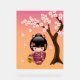 Illustration vectorielle d'une mignonne fille orientale en robe kimono cerise foncée avec une large ceinture obi tenant une lanterne en papier du festival jaune. Les cheveux noirs de la fille sont décorés de fleurs et de épingles à cheveux de style geisha. Cette oeuvre a été inspirée par les poupées kokeshi traditionnelles du Japon. Sakura est un cerisier japonais, également utilisé comme nom de fille. Un cerisier en fleurs fait un simple arrière - plan.