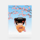 Illustration vectorielle d'une mignonne fille orientale en robe kimono couleur pêche avec une large ceinture en prune obi tenant un sac à cordes kinchaku rose. Les cheveux noirs de la fille sont décorés de rubans et de épingles à cheveux de style geisha. La poupée porte le nom d'un arbre à mûre japonais qui est lié à la fois aux pruniers et aux abricotiers. Cette oeuvre a été inspirée par les poupées kokeshi traditionnelles du Japon. L'arrière - plan bleu clair est décoré de branches d'arbres en fleurs.
