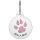 Empreinte de patte à paillettes roses avec le nom du chien sur le devant sur fond blanc, au dos fond d'alerte rouge avec texte blanc qui dit OH Snap ! Je suis perdu - Appelle ma mère, elle pleure laidement. Le fond rouge attire l'attention sur le médaillon pour que la personne qui trouve le chien voie l'alerte.