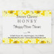 Une étiquette de 7,6 cm x 5 cm avec des abeilles sur un nid d'abeille jaune avec du miel doré en haut et en bas, et des lettres bloc et script modifiables en brun foncé pour votre type de miel, nom, poids ou onces et votre adresse ou autres informations.
