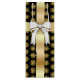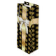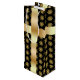 Un élégant sac à vin avec un arrière - plan noir et un motif de flocon doré. L'avant et l'arrière du sac ont un ruban doré. Sur le devant il y a un arc blanc.