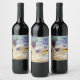 L'art montre une bouteille de vin rouge, deux verres à vin et du fromage sur une plage de sable avec coquillages. Dans l'arrière - plan se brisent les vagues de l'océan. Customisez ce étiquette de bouteille de vin avec votre message personnalisé pour faire des cadeaux spéciaux personnalisés de vin!