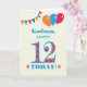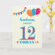 Carte d'anniversaire colorée pour un filon de 12 ans, Le grand numéro 12 est rempli d'un motif orange, rouge et bleu, surligné de bleu vif. Il y a des ballons et du bunting en haut, dans des couleurs assorties et l'accueil de couverture est : "Godson, vous avez 12 ans aujourd'hui !" en lettres rouge et bleu vif, sur un arrière - plan de pois jaune et blanc très pâle, avec des étoiles rouges et orange de chaque côté du mot "AUJOURD'HUI !". Le message intérieur peut être facilement customisé ou supprimé si vous le souhaitez.