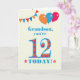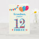 Carte d'anniversaire colorée pour un petit-fils de 12 ans, Le grand numéro 12 est rempli d'un motif orange, rouge et bleu, surligné de bleu vif. Il y a des ballons et du bunting en haut, dans des couleurs assorties et l'accueil à la couverture est : "Grandson, tu as 12 ans aujourd'hui !" en lettres rouge et bleu vif, sur un arrière - plan à pois jaune et blanc très pâle, avec des étoiles rouges et oranges de chaque côté du mot "AUJOURD'HUI !". Le message intérieur peut être facilement customisé ou supprimé si vous le souhaitez.