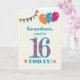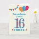 Carte d'anniversaire colorée pour un petit-fils de 16 ans, Le grand numéro 16 est rempli d'un motif orange, rouge et bleu, surligné de bleu vif. Il y a des ballons et du bunting en haut, dans des couleurs assorties et l'accueil à la couverture est : "Grandson, tu as 16 ans aujourd'hui !" en lettres rouge et bleu vif, sur un arrière - plan à pois jaune et blanc très pâle, avec des étoiles rouges et oranges de chaque côté du mot "AUJOURD'HUI !". Le message intérieur peut être facilement customisé ou supprimé si vous le souhaitez.