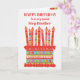 Vous pouvez ajouter l'âge à cette carte d'anniversaire aux couleurs vives pour votre beau-frère, avec un gâteau d'anniversaire aux fraises. Le gâteau a beaucoup de bougies avec différents motifs et il y a une bande à motifs autour du gâteau avec des fruits d'été colorés - fraises, framboises, citron vert et tranches d'orange. Au-dessus du gâteau, l'accueil, en lettres rouges, est "HEUREUX ANNIVERSAIRE à un Step Brother très spécial" et sur le gâteau il y a un espace pour ajouter l'âge, suivi par "ans today !" en lettres blanches. N'hésitez pas à customiser le message intérieur si vous le souhaitez ; vous pouvez changer la police et la couleur ainsi que le message.