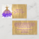 Carte de visite fascinant d'ouvrière couturière de robe, avec des graphiques d'une robe de parties scintillantes de pourpre et d'or, sur un fond blanc et goldtone, avec des parties scintillantes d'or regardant des accents. Personnalisez le texte pour adapter à vos besoins d'affaires. Un beau tient la carte pour vos affaires de mise sur pied.