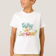 Le design des t-shirts comporte l'expression "Pourquoi est-ce si grave ?" en caractères gras et multicolores contre un arrière - plan ordinaire. Les couleurs sont vibrantes et ludiques, créant une ambiance amusante et énergique. Le design est simple mais attrayant, ce qui en fait un choix polyvalent et élégant pour n'importe quelle armoire