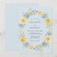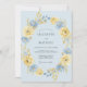 A delicate watercolor design features a soft powder blue background adorned with a lush arrangement of sun-drenched yellow and sky blue blossoms. This romantic design evokes the fresh, airy feel of a bright morning during the spring season. Beautifully rendered roses, ranunculus, and delicate greenery create an ethereal and elegant look.