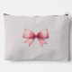 This makeup pouch features a charming pink bow pattern aesthetic on the front and a single bow on the back, all set against a powder pink background, making it a functional yet stylish accessory.