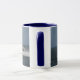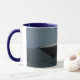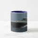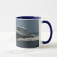 This is a blue and white mug featuring an original photograph of a power boat speeding across the water.