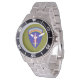 Has heft and feel of expensive stainless steel quartz watches. Good band with safety catch.  I removed links, which is easy because engraved arrows show direction to push the linking pins. As always by this seller, the image (a railroad logo) is a perfect reproduction of my emailed image, and is precisely spaced and aligned.