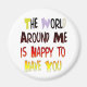 Brighten any space with our Powerful Welcome Message: A Motivational Quote! This striking artwork features bold black, red, and golden yellow text displaying the uplifting message: "The world around me is happy to have you," set against a clean white background.