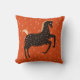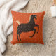 This attractive and distinctive throw pillow has a prancing black pony with a Nordic style gold pattern across it. The image is placed on a red and gold matching pattern. The back of the pillow has the same red and gold pattern without the horse image.