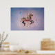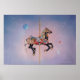 A dramatic black carousel horse with trappings in jewel tones of royal blue, deep red, purples and accented with carved pink rosettes. Feel free to personalize your purchase to make it your own.