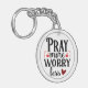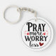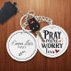Religious typography "Pray More Worry Less" with bright red apples, and curled lines, deep red heart, and a round black border. Customizable name on the back.