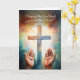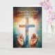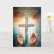 A pair of hands uplifted in prayer with a cross lit from behind with rays in a rainbow of colours creates a surrealistic Christian encouragement card.