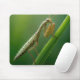 A close-up view showcases a praying mantis perched on a green blade of grass, highlighting its intricate details and natural camouflage