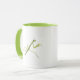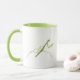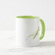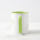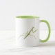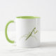Painting of a Praying Mantis by Cheryl Paton, is printed on two sides of custom mugs. The background colour can be customized. The praying mantis is a large green insect.