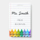 Featuring a lined notebook background and a vibrant crayon border, this badge is perfect for preschool and elementary educators. Personalize it with your name, grade level, and room number to create a fun and professional look that helps students, parents, and staff feel instantly connected.