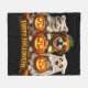 Ready for the ultimate spooky season snuggle with this trick or treat trio fleece blanket this high detail vibrant design features an adorable mummy kitten a happy pumpkin puppy and a ghostly cat all showing off their overflowing candy buckets set against a deep velvety black background with a bold happy Halloween banner this soft and warm throw is perfect for movie nights chilly autumn evenings or as a festive bedspread