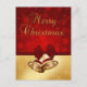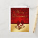 Elegant and unique Christmas illustration featuring 2 golden Christmas bells with red bow and ribbon on different backgrounds: a red bokeh background and a golden snowflakes background.