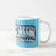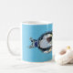 Cool ceramic mug, with graphic artwork of a great white shark trapped in a water bottle, against a blue swirl wave background. Customize to add your own text.