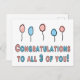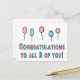 A fun pregnancy congratulations design shows the message "congratulations to all 3 of you!" with some hand drawn balloons above - all in pink and blue colors.