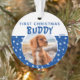 Premier Noël Blue Star Motif Chien Chien Chien Chien Chien Photo Ornement. L'arrière - plan est bleu avec des étoiles blanches. Personnalisez l'ornement avec la photo, le nom et l'année de votre chien. Vous pouvez l'utiliser pour n'importe quel animal de compagnie. Un grand souvenir de vacances pour vous ou un cadeau pour votre famille et vos amis.