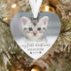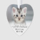 Ornement personnalisé en forme de cœur pour la photo de mon premier Noël avec mon chat. Célébrez le tout premier Noël de votre chaton avec cet ornement charmant et fait sur mesure, conçu pour capturer la joie de la première saison des fêtes de votre félin adoré. Le devant présente un espace pour une photo de votre chaton avec la phrase "Mon premier Noël" en calligraphie élégante, ainsi que le nom de votre chat et l'année de naissance pour une touche personnelle. Au dos, il y a de la place pour une deuxième photo associée à "Joyeux Noël" dans la même écriture délicate, avec le nom et l'année de votre chat affichés en plus petit en bas. Des accents de flocons de neige gris clair ajoutent une touche de charme hivernal, tandis qu'un effet ombré blanc doux en bas de chaque photo crée une transition harmonieuse et raffinée. Les couleurs de la police et des flocons de neige peuvent être personnalisées pour correspondre à votre style. Cet ornement souvenir est parfait pour les mamans et les papas de chats, ou pour toute famille aimant les félins qui