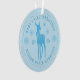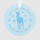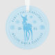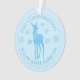 Ornement bleu ciel moderne pour le premier Noël de bébé personnalisable avec le nom du bébé, année, cerf avec un nœud, flocons de neige et lettrage incurvé en police serif.
