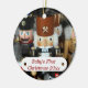 Premier Ornement de Noisette Personnalisé de Noël du bébé. L'un des côtés indique "Baby's First Christmas 20xx" et l'autre côté a le nom et la date de naissance du bébé. Il vous suffit de remplir vos propres détails. Il a un mignon Nutcracker décorations de Noël arrière - plan des deux côtés de l'ornement.