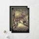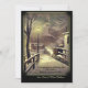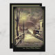 Scène vintage d'une nuit hivernale enneigée avec la lueur dorée d'un lampadaire montrant le chemin.