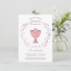 Cet invitation moderne de la première sainte communion possède une élégante couronne fleurie rose et violet de style aquarelle ainsi qu'un chalet et une hôte assortis. Idéal pour célébrer le sacrement religieux d'une fille, il peut être customisé avec le nom de votre enfant et les détails de l'événement.