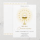 Élégante invitation de première communion solennelle comprenant calice, étoiles dorées et croix.