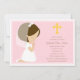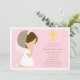 Invitation Pink First Holy Communion avec une brune agenouillée sur la gauche, croix jaune avec Communion ou détails du parti sur la droite en marron.