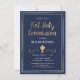 Cette invitation moderne et classe de la Première Sainte Communion comporte un calice d'or illustré une bordure bleue, verte et dorée, et les mots "Première Sainte Communion" en or (détails simulés de feuille). L'arrière - plan est bleu marine, mais peut être customisé à n'importe quelle couleur que vous choisissiez. Le texte est personnalisable pour votre sacrement religieux spécial.