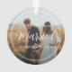 Célébrez votre mariage avec ce magnifique ornement de gardien classique. Le texte blanc indique "Notre premier Noël", avec le mot "Marié" ci-dessous dans un élégant script manuscrit. Vos noms et votre année sont dans la police serif classique. Remplacez l'espace réservé photo par votre photo préférée. La photo est encadrée d'une élégante bordure pointillée. Un filtre dégradé foncé fait apparaître le texte blanc et la bordure.