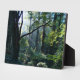 Des rayons blancs brillants du soleil matinal jaillissent de branches sombres vers une forêt estivale verdoyante, avec des arbres massifs recouverts de lierre et des pinces fertiles.