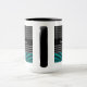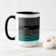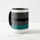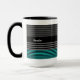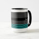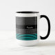 A preppy mens fashion mug with fresh teal and black stripes on the bottom and a trendy black and grey striped pattern on the rest of the case. Personalize by adding your name to this modern contemporary style mug.