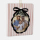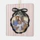 Festive Crimson Red Preppy Stripe Pattern with Black Ribbon Bow Photo Frame, Christmas Ornament.