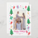 Share your favourite family photo with this preppy Christmas inspired holiday card. Featuring a collection of Christmas trees, presents, rainbow candy canes and stockings in a merry and bright colour palette.