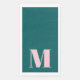 Preppy, simple, minimalist monogram-themed party supplies in deep blueish green and pastel pink colours.