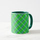 A coffee mug with a fresh green preppy plaid pattern with small white and blue stripes.
