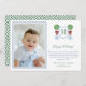 Preppy Happy Holidays photo card design featuring a Boxwood topiary tree with red bow, in a blue planter. In front of this is a crest shape with space for a single letter monogram. The watercolor elements were originally handpainted by me in watercolors onto 100% cotton paper before being scanned and arranged / styled digitally (the crest shape is by another artist). The reverse side features a Greek Key pattern, created digitally by me. You can change the contrast colour on the reverse (currently a forest green) by changing the background colour on the reverse (click to customize further underneath the text customisation area. This will take you into the design tool.