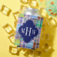 Preppy Patchwork Madras Navy Quatrefoil Monogram Can Cooler