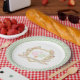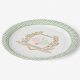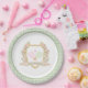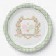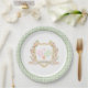 Set the stage with these beautiful custom pickleball birthday party plates. This design has a watercolor image of a crest surrounded by branches with green and pink gingham pickleball paddles in the centre. There is a green gingham border around the edge. Text says "Happy Birthday." Colours used include moss green, blush pink and and tan.